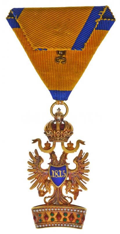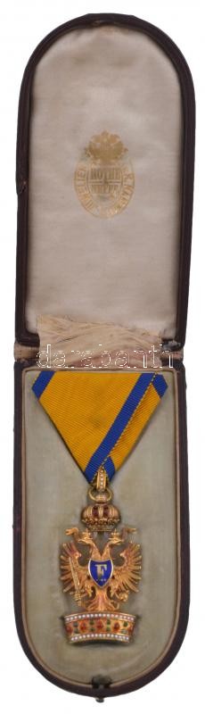 Austro-Hungarian Monarchy 1884. "Order of the Iron Crown, 3rd Class" enamelled, hallmarked Au decoration with ribbon, with makers mark "F.R (Firma Rothe)" and with "750" hallmark, in repaired original case (55x29mm) C:AU tiny edge error