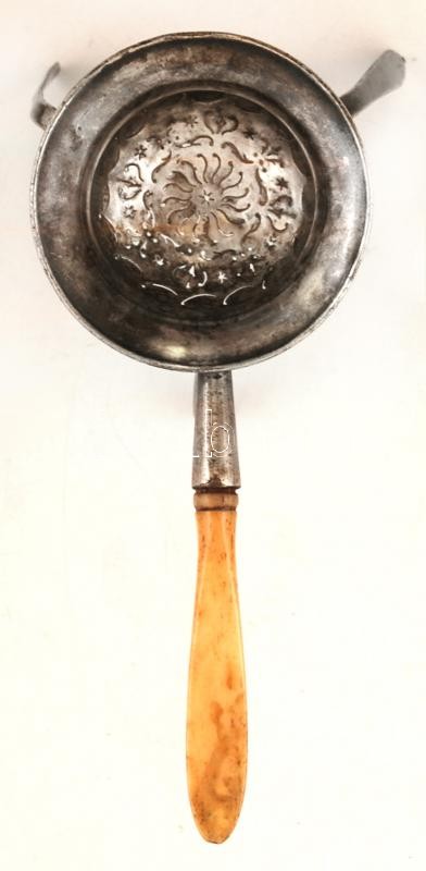 Ezüstözött teaszűrő csontnyéllel, kopottas, 7x15cm