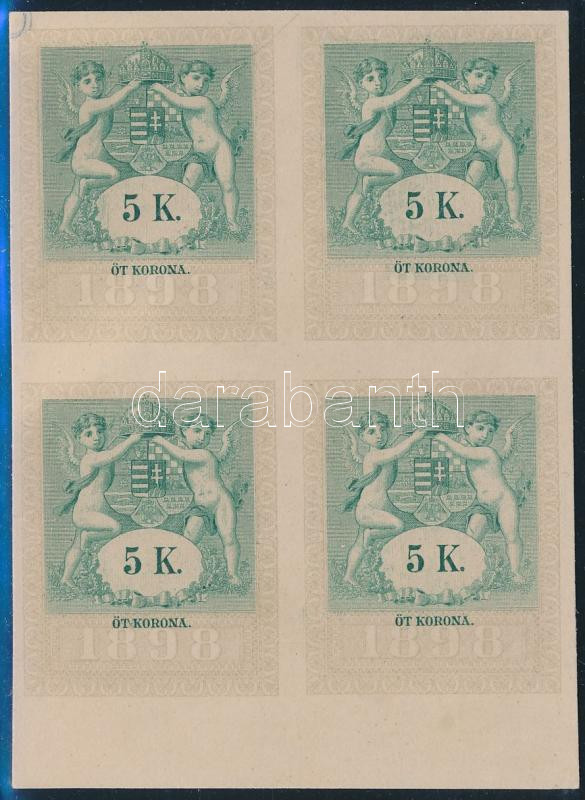 1898 5K okmánybélyeg ívsarki négyestömb kartonpapírra nyomva