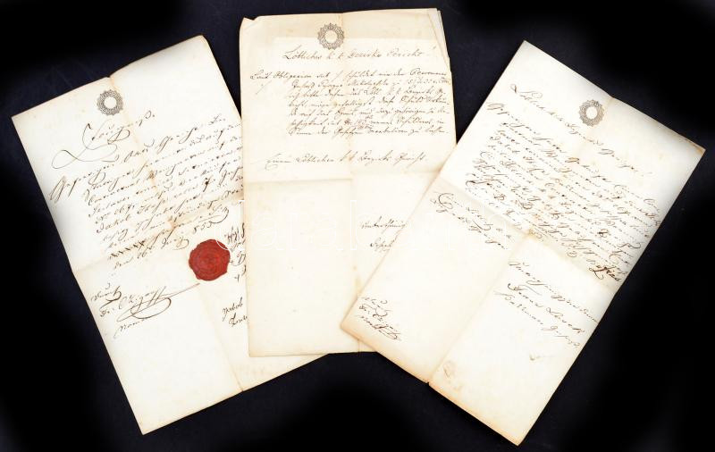 1853-1854 3 db német nyelvű okmány (tanúsítvány, ill. 2 db kérvény), szignettával, az egyik érdekes rányomott községi viaszpecséttel