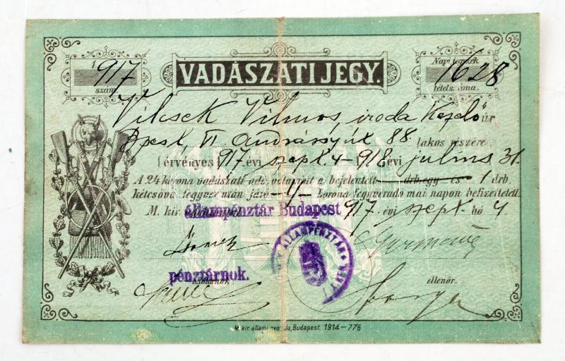 https://www.darabanth.com/en/258-Online-auction/258.0/Other-collectibles/Documents~15/1917-Vadaszati-jegy-Budapest-11x17cm~II1269128