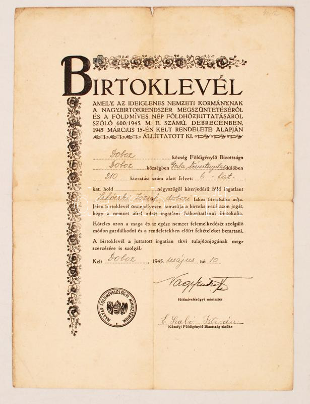 1945 Doboz, Az Ideiglenes Nemzeti Kormány nagybirtokrendszer megszüntetéséről szóló rendelete alapján kiadott birtoklevél