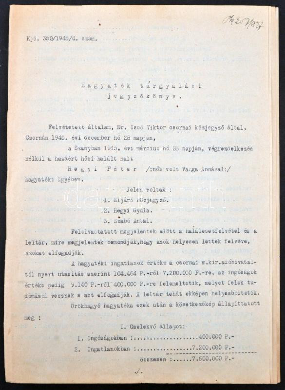 1945 Hagyaték tárgyalási jegyzőkönyv 100 x 20Pengő törvénykezési illet...