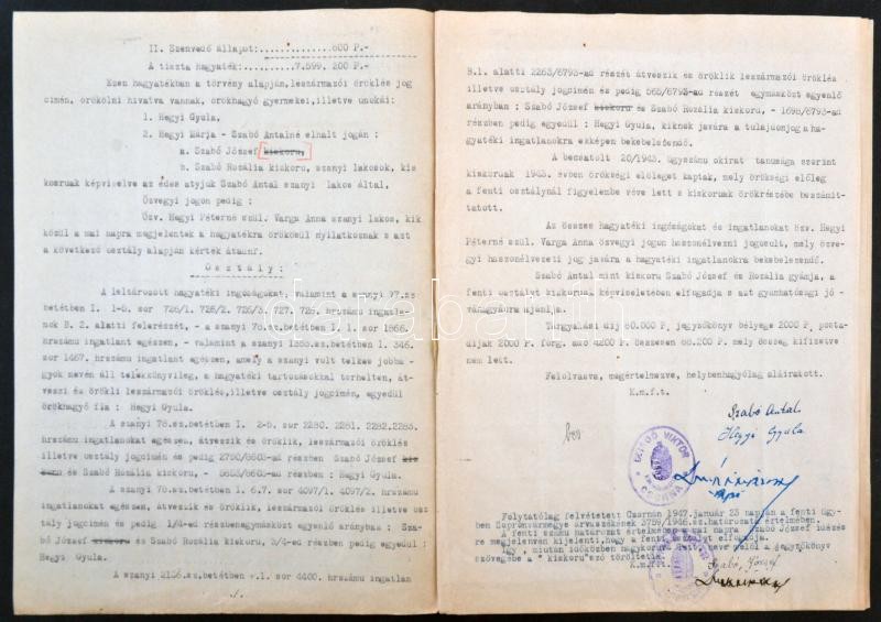1945 Hagyaték tárgyalási jegyzőkönyv 100 x 20Pengő törvénykezési illetékbélyeggel