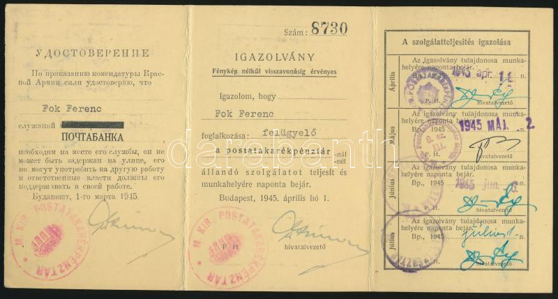 1945 Igazolvány magyar-orosz nyelven Fok Ferenc felügyelő részére kiál...