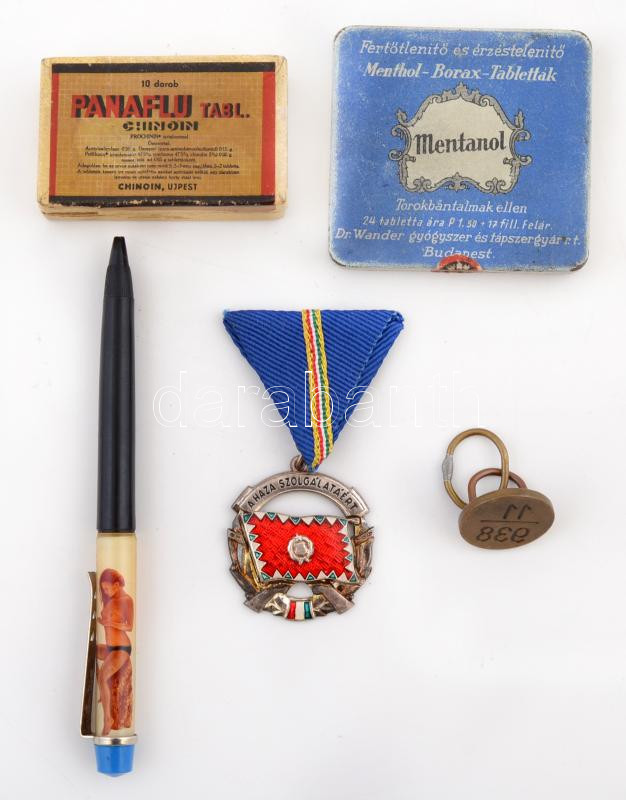 2 db régi dobozka(Mentanol, Panaflu), toll, kitüntetés, pecsét