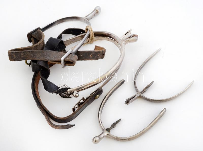 5 db régi sarkantyú, egy pár, fém-bőr, 11×8 cm