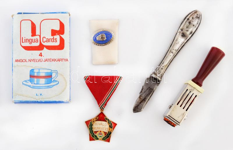 Kis vegyes bolha tétel: törött ezüstnyelű kés, pecsétnyomó, játékkártya, jelvények