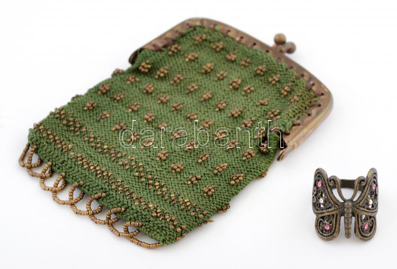 Régi szütyő, apró hibával, 10×7 cm, pillangós gyűrű, méret:57 cm