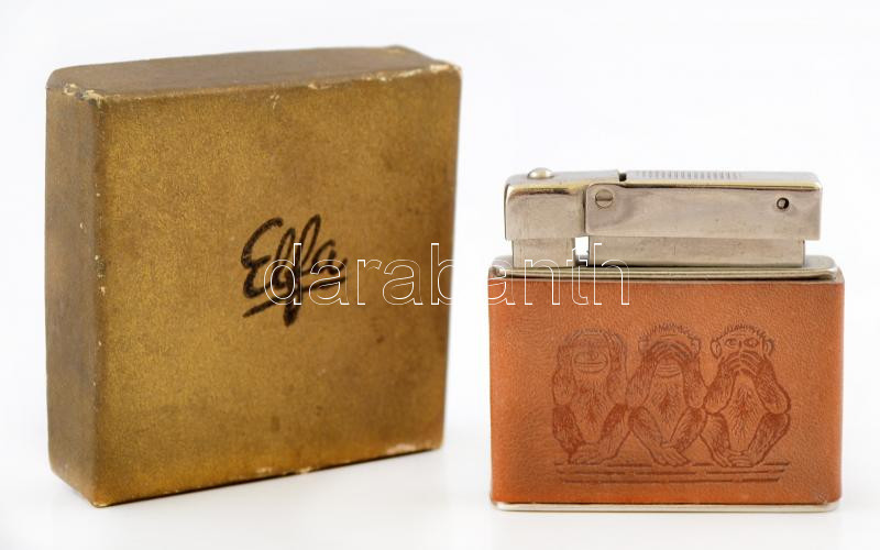 Tűzköves öngyújtó bőr borítással, eredeti dobozában, 4x4,5x1 cm