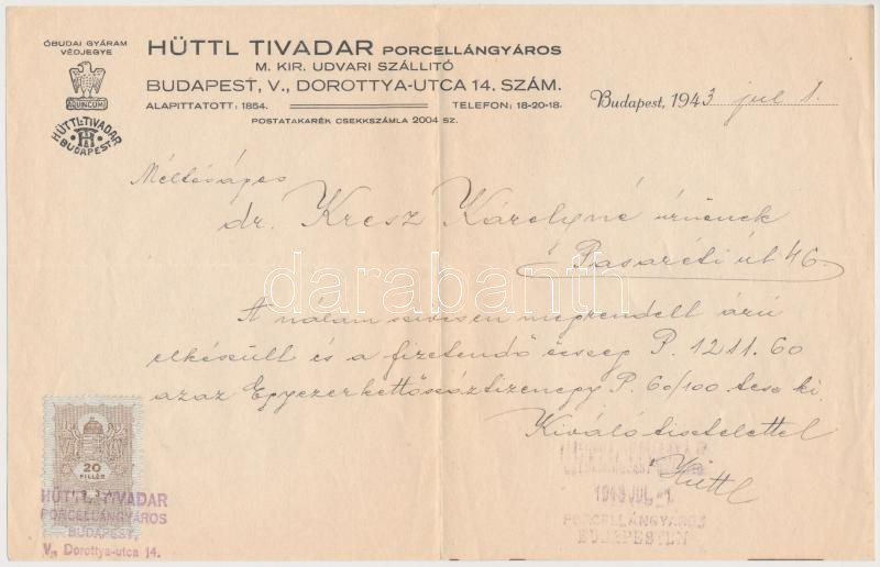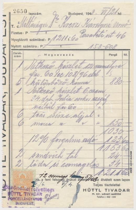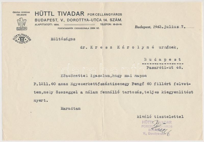 1943 Hüttl TIvadar porcelánygyáros (Aquincum) 3 számlája, rajta saját ...