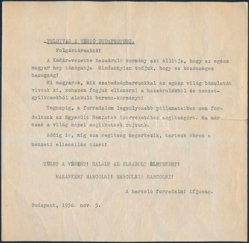 1956. november 5. Géppel írt röplap a forradalomból "A harcoló forradalmi ifjúság" aláírással