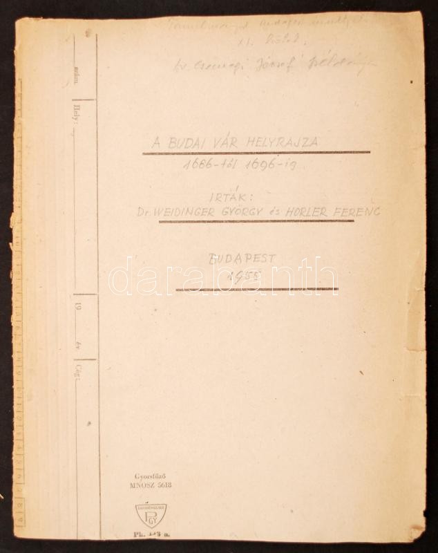 A Budai Vár helyrajza 1686-tól 1696-ig, nyomtatott kézirat Weidinger György - Horler Ferenc, Budapest 1955 dr Csemegi József példánya, kéziratos bejegyzésekkel, + 1 fotó kartonra kasírozva, 12x16cm
