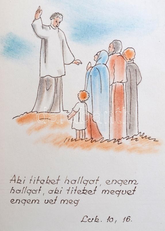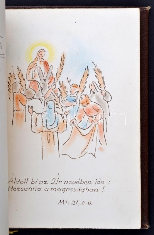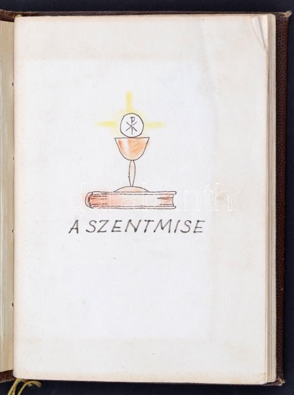 A szentmise kötelező részei. Kézzel írt, kézzel színezett füzet, minden részhez egy-egy bibliai idézettel.