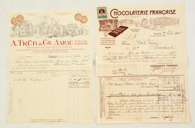 Description: 1900, 1905 2 db díszes, szecessziós stílusú fejléces számla(Chocolaterie Francaise, A. Trüb&Cie Aarau) /