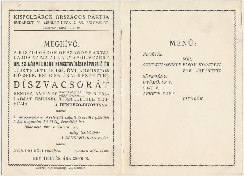 1926 Meghívó a Kispolgárok Országos Pártjának díszvacsorájára.