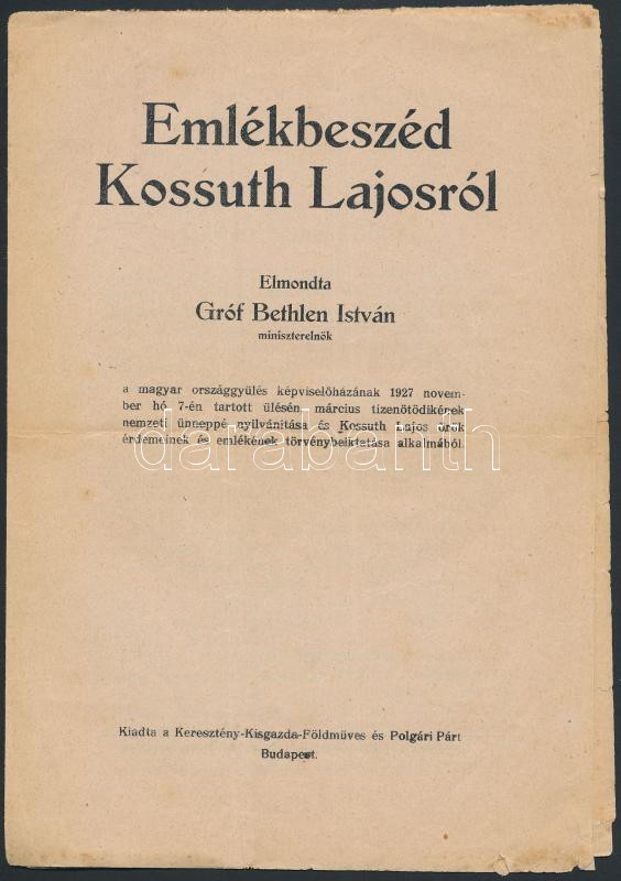 https://www.darabanth.com/en/258-Online-auction/258.0/Other-collectibles/Printed-Materials~26/1927-Emlekbeszed-Kossuth-Lajosrol-Elmondta-grof-Bethlen-Istvan-miniszterelnok-az-Orszaggyu~II1266661