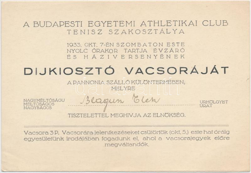 1933 A Budapesti Egyetemi Athletikai Club meghívója díjkiosztó vacsorá...