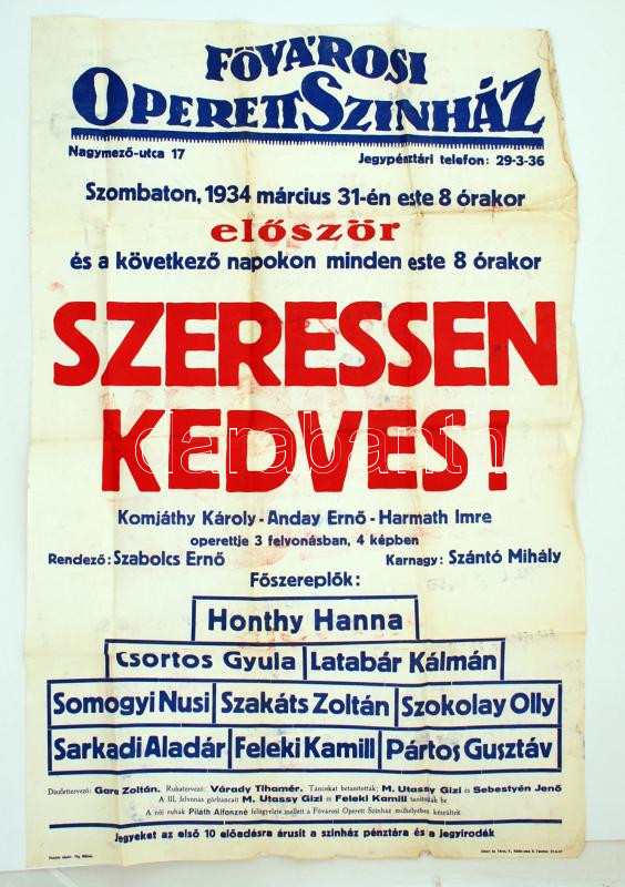 1934 A Fővárosi Operettszínház "Szeressen kedves" című előadásának premierjét hirdető plakát, hajtott, 63x94 cm