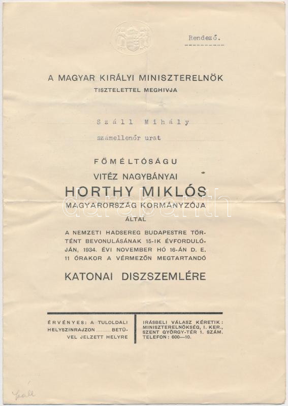 1934 Meghívó a Nemzeti Hadsereg Budapestre történő bevonulásának 15. évfordulója alkalmából rendezett ünnepségre
