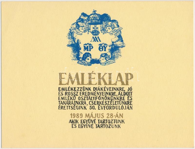 1984, 1989 2 db emléklap a Budapesti Piarista Gimnáziumból, Biczó Tamás grafikus hagyatékából, aláírásokkal