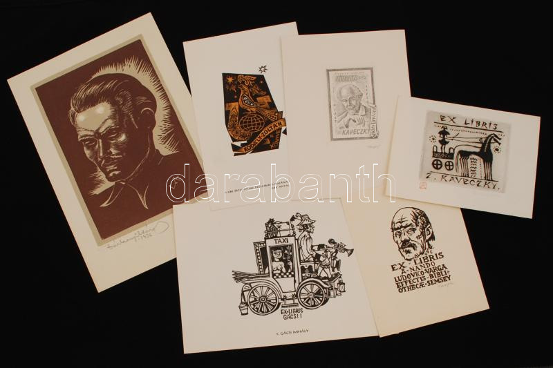 Vegyes ex libris tétel, linó, fa- és acélmetszet, aquatinta, mind jelzett, 2db dúcon, Gácsi Mihály (1926-1987), Fery Antal (1908-1994), Kaveczky Zoltán (1897-1965), Varga Nándor( 1895-1978), Tempinszky István (1907-1979), Várkonyi Károly (1910-2001), 6db, különböző méretben, 7x9cm és 18x13cm között