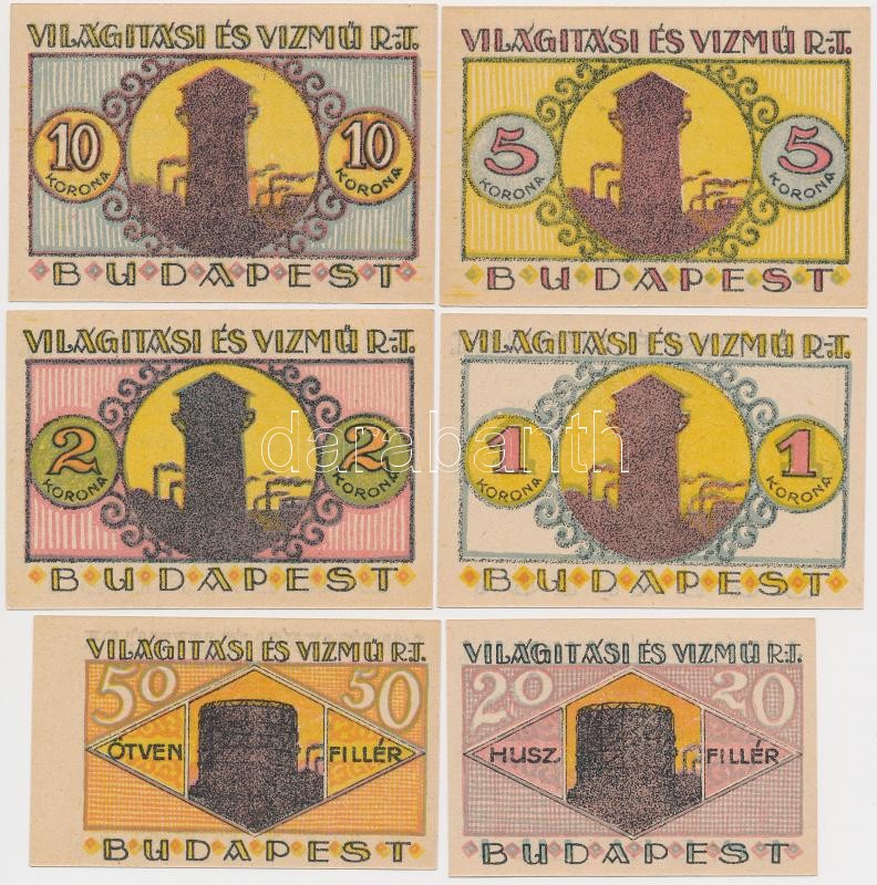 Budapest 1920. 20f + 50f + 1K + 2K + 5K + 10K "Világítási és Vízmű Rt." utalványok T:I