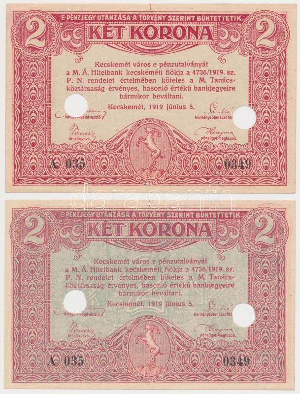 Kecskemét 1919.06.05. 2K lyukasztva, azonos sorszámú hamisítványok / fakes (2x) T:I
