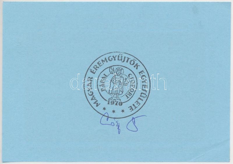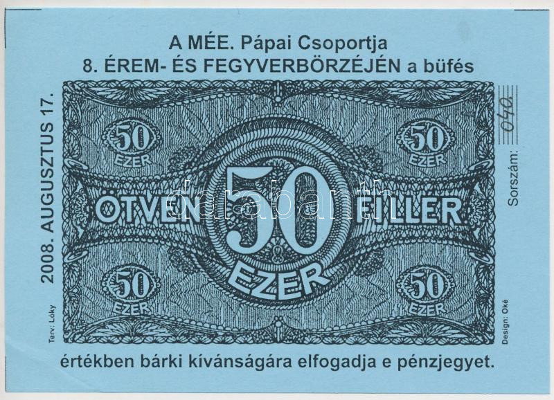Description: Pápa 2008. "A MÉE Pápai Csoportja 8. Érem- és Fegyverbörzéje" 50.000f alkalmi pénz, "040" sorszámmal, hátlapján "Magyar Éremgyűjtők Egyesülete - Pápai Csoport 1970" felülbélyegzéssel, a tervező Lóky aláírásával T:I-