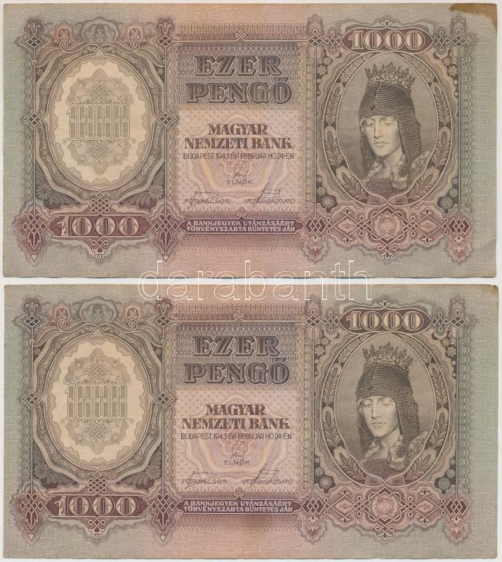 https://www.darabanth.com/en/259-Online-auction/259.0/Numismatics/Hungarian-Banknotes~100008/1943-1000P-2x-kozeli-sorszamuak-TI-II-hajtatlanok-folt~II1277436