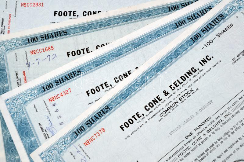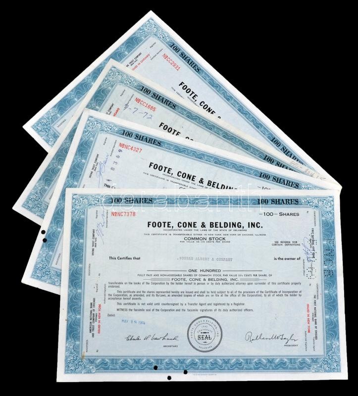 Amerikai Egyesült Államok / Delaware 1963-1964. "Foote, Cone & Belding, Inc." 100 részvénye egyenként 33 1/3c-ről, lyukasztott, perforált, bélyegzéssel T:I-,III USA / Delaware 1963-1964. "Foote, Cone & Belding, Inc." 100 shares, each about 33 1/3 Cents, perforated, punctured with overprint C:AU,F