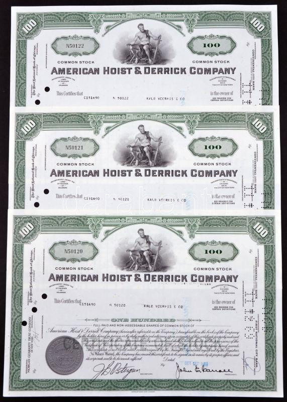 USA / Delaware 1969. "American Hoist & Derrick Company" 100 shares with perforation, stamps, cancelled by holes, (3x) with sequential serials C:AU
