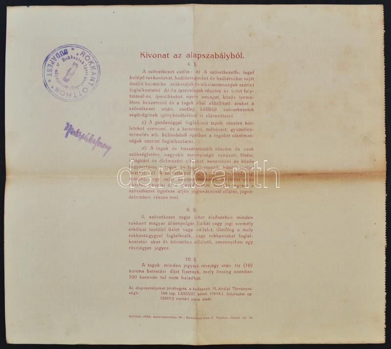 Budapest 1920. "Rokkant Otthon - Rokkantak Ipari és Gazdasági Szövetkezete" részjegy 100K-ról, felülbélyegzett T:III