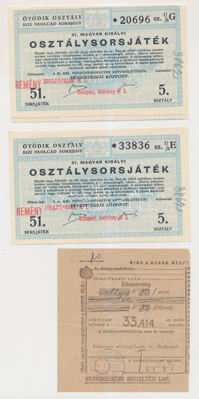 Budapest 1944. "51. Magyar Királyi Osztálysorsjáték" 1/8 sorsjegy, 5. osztály (2x), mellette az "50. Osztálysorsjáték" játékterve T:I