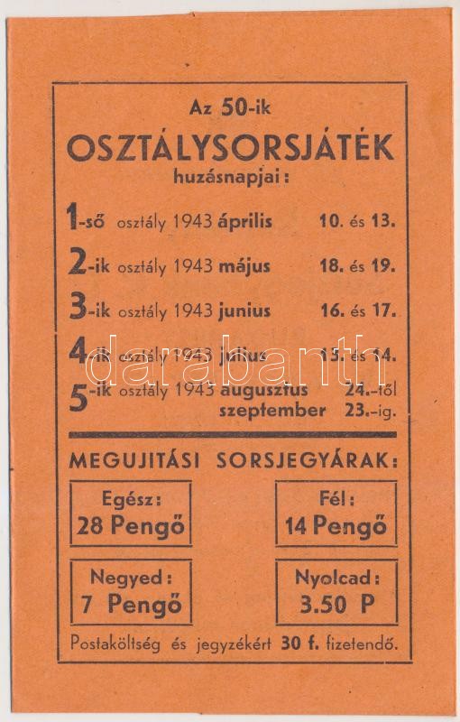 Budapest 1944. "51. Magyar Királyi Osztálysorsjáték" 1/8 sor...