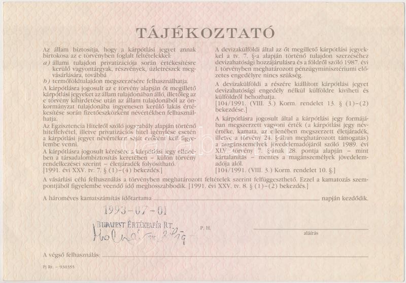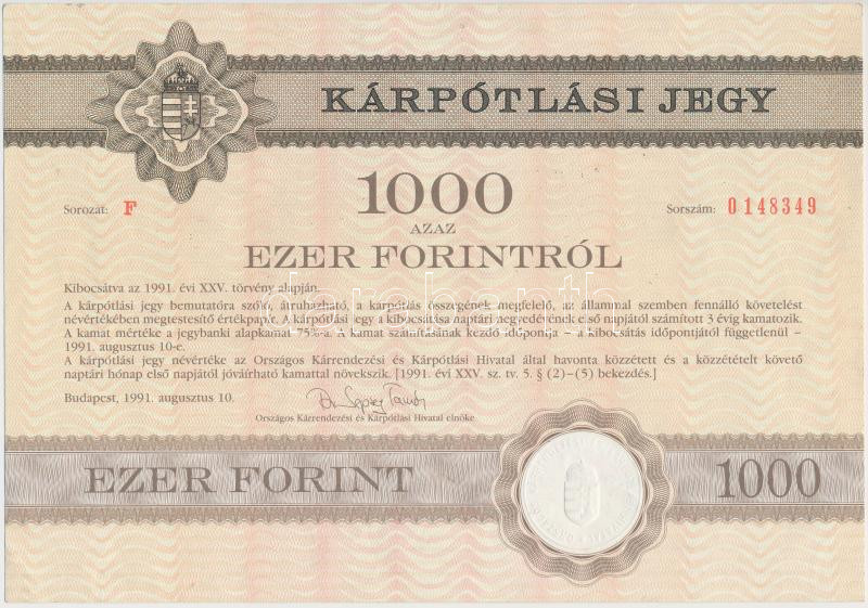 Budapest 1991. "Országos Kárrendezési és Kárpótlási Hivatal" kárpótlási jegye 1000Ft-ról, "F" sorozat T:I-