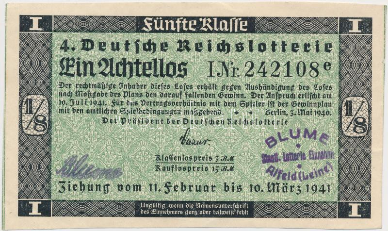 Description: Német 3. Birodalom 1940. "4. Német Birodalmi lottó" 1/8 sorsjegy, 5. osztály, bélyegzéssel T:III szép papír