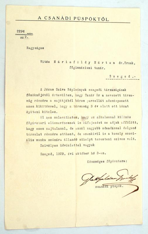 1929 Glattfelder Gyula (1874-1943) csanádi püspök autográf aláírása gépelt levélen.