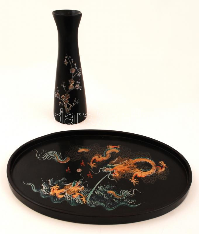 Gyöngyház berakásos festett fa váza és egy festett fa tálca, m:25 cm, 35×24 cm