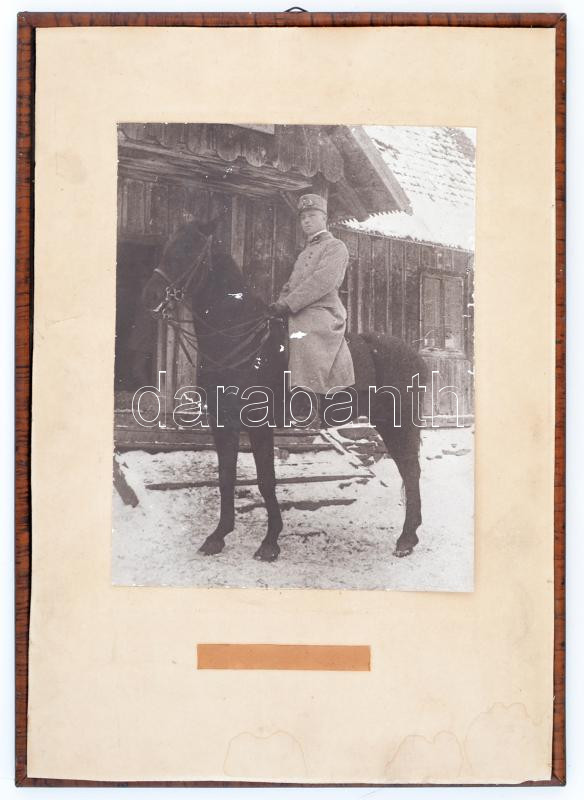 Description: cca 1914-1918 Toma Imre (1884-1946) plébános, tábori lelkész, későbbi esperesről készült nagyméretű lovas fotó a keleti frontról, kartonra kasírozva, fa keretben, 28x23 cm