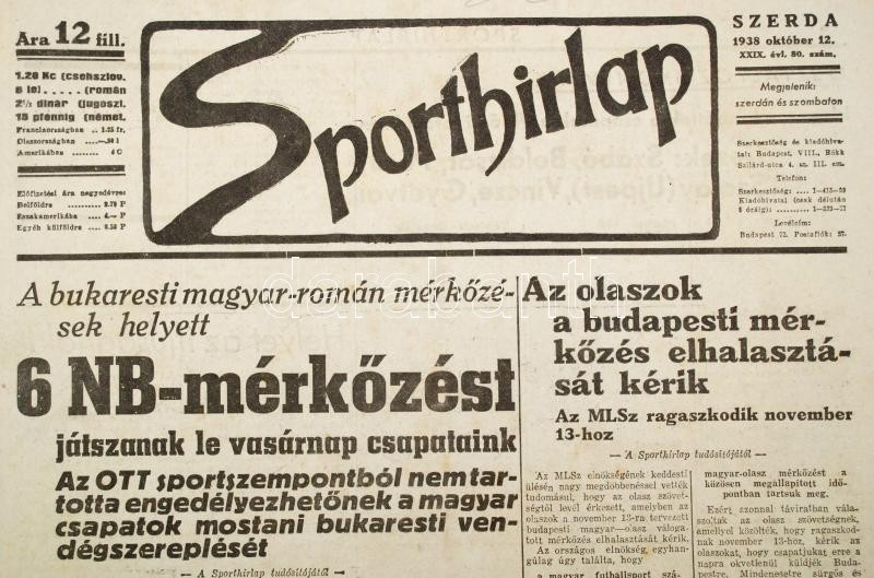 1938 Sporthírlap okt. 12-i száma sok érdekes cikkel, pp.:8, 47x31cm