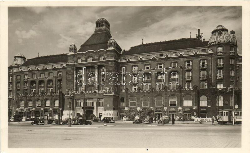 Budapest XI. Gellért szálloda, Gundel Gellért söröző, Tóth József cipész üzlete, Magyar Kereskedelmi Rt. IBUSZ Tourist Office, villamos, automobil
