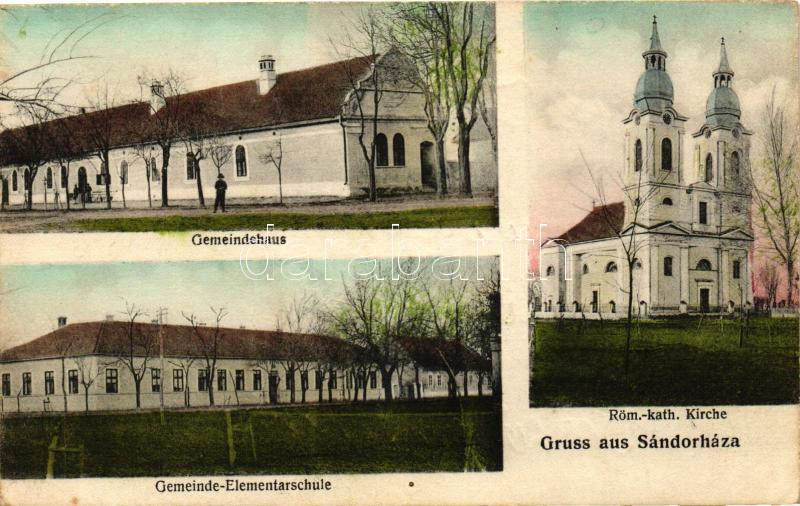 https://www.darabanth.com/en/259-Online-auction/259.0/Postcards/Transylvania~300007/Sandorhaza-Sandra-Kozossegi-haz-Romai-Katolikus-templom-elemi-iskola-kiadja-Kugel-Karol~II1276822