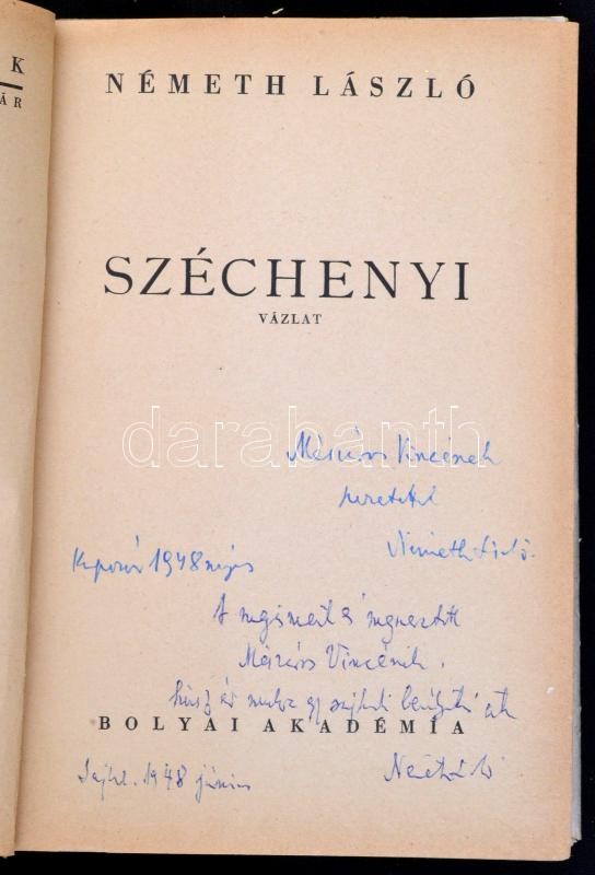 Description: Németh László: Széchenyi. Vázlat. Bp., é. n., Bolyai Akadémia (Bolyai könyvek). A szerző kettős dedikációjával. Félvászon kötésben, kissé kopott papír védőborítóval, egyébként jó állapotban.