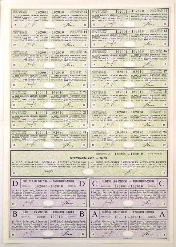 Budapest 1927. "Első Budapesti Gőzmalmi Részvénytársaság" tíz részvénye egyben összesen 500P-ről, szelvényekkel, szárazpecséttel T:II / Hungary 1927. "Első Budapesti Gőzmalmi Részvénytársaság" ten share in one, in total sum of 500 Pengő, with coupons and embossed stamp C:XF