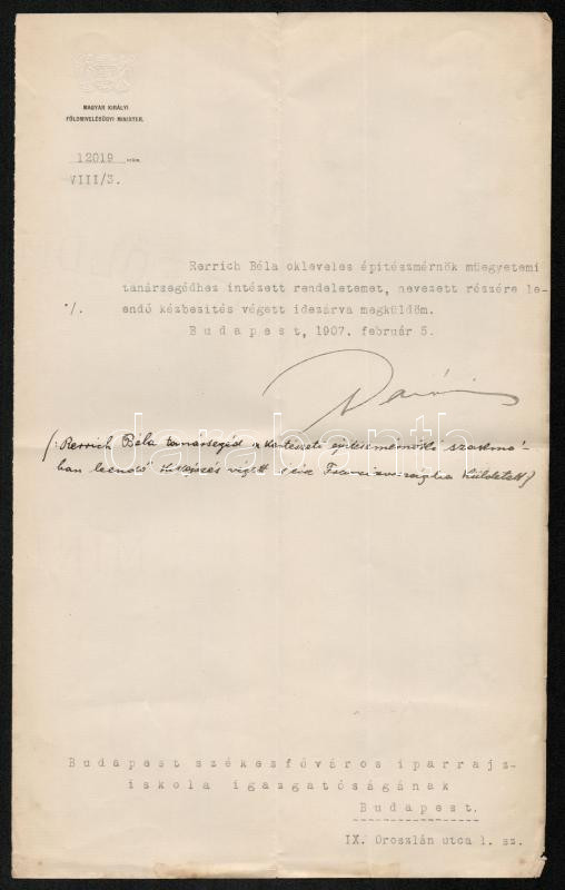 1907 Darányi Ignác (1849-1927) földművelésügyi miniszter aláírása hivatalos levélen