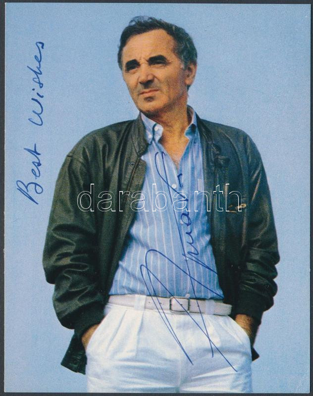Charles Aznavour (1924- ) énekes aláírása őt magát ábrázoló fotólapon ...