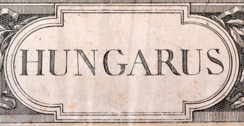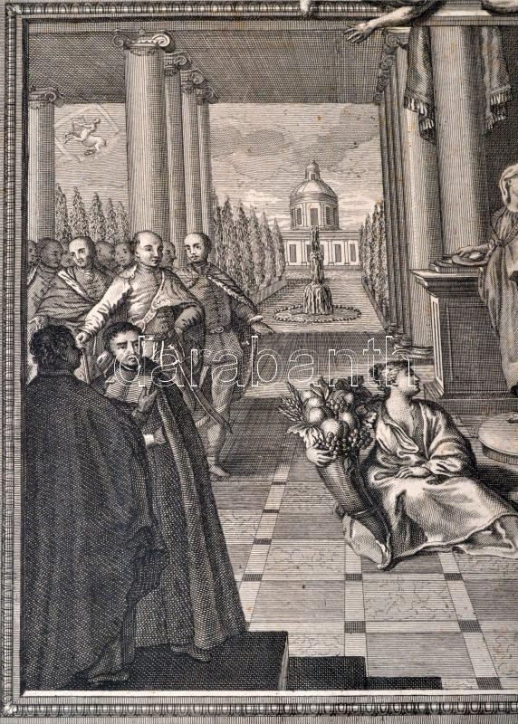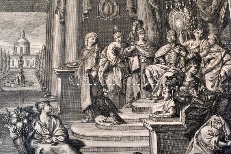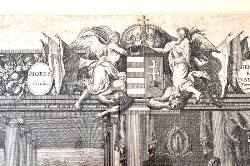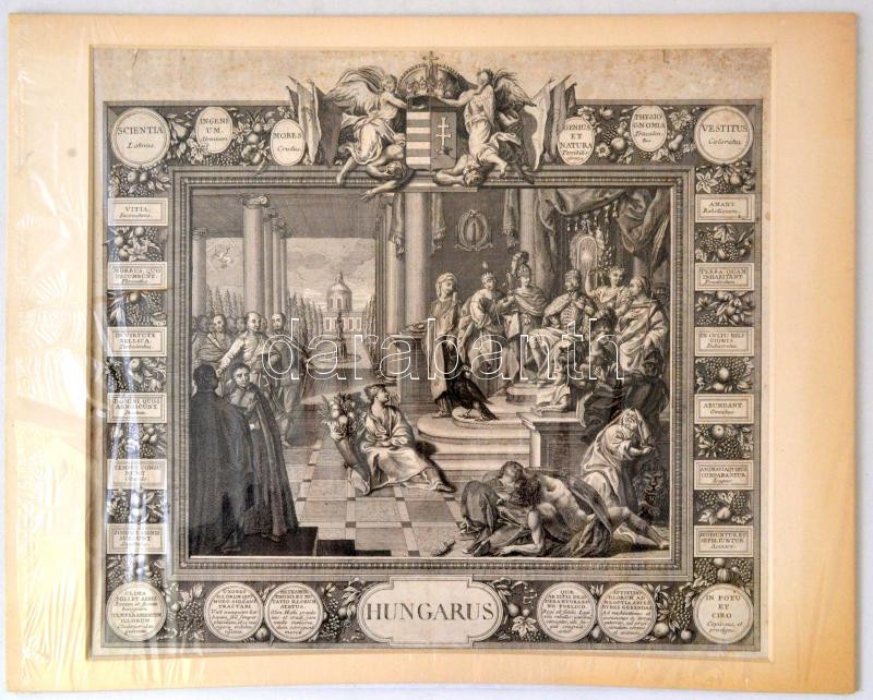 cca 1800 A magyar nép allegorikus jellemzése; III. Károly (1685-1740) magyar király trónoló alakja látható erényalakok társaságában, a bal oldalon magyar nemesek és papok, fent középen a magyar címer, a kereten gyümölcsök és a magyarok tulajdonságait latin nyelven leíró medalionok és kis táblák, jelzés nélkül, papír, rézmetszet, paszpartuban, kisebb szakadásokkal, 35x40 cm./ cca 1800 The allegoric characterization of the hungarian people. III. Charles (1685-1740) on the throne with figures of virtues. On the left side with hungarian nobles and priests. Central, up side of the picture with the coat of arms of Hungary. Around of the picture with the atributes of the hungarians, in latin language, unmarked, paper, copper engravings, in paspartu, with some small damage, 35x40 cm.