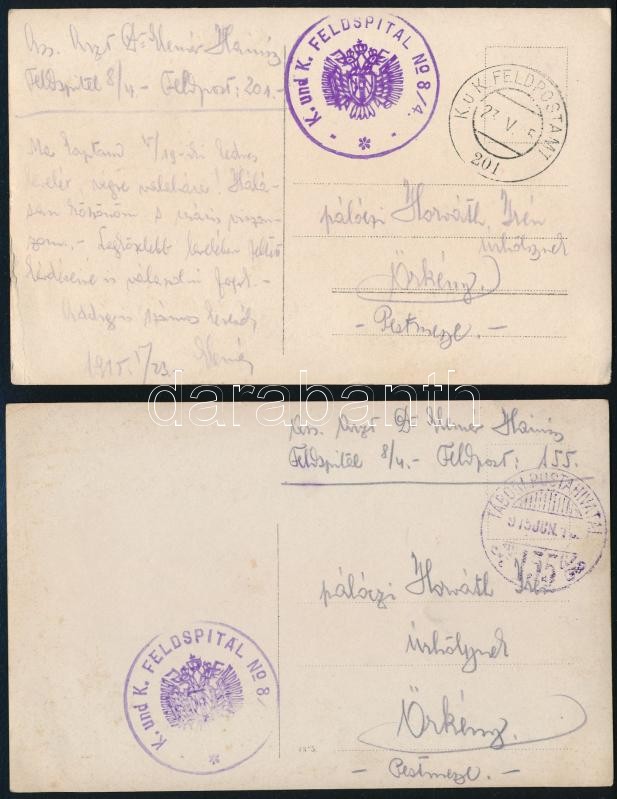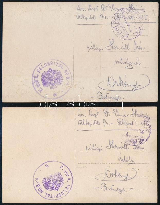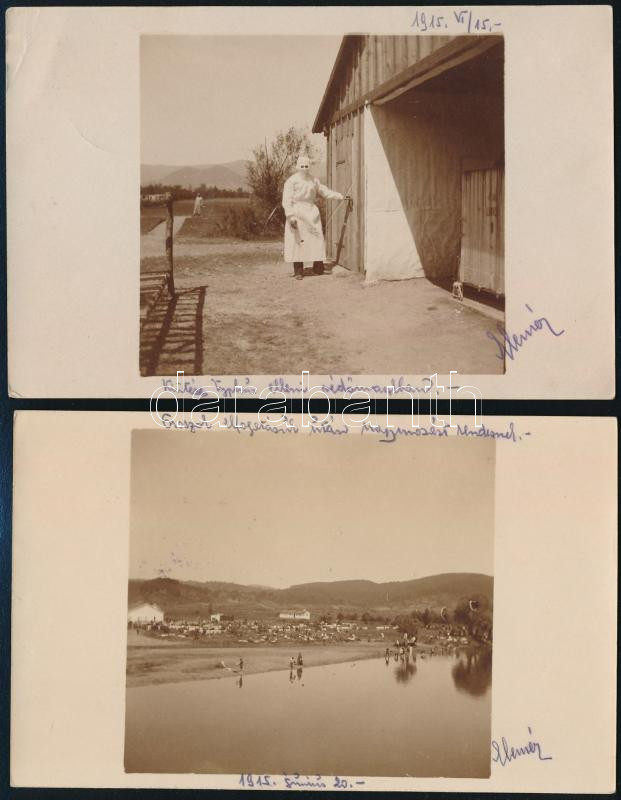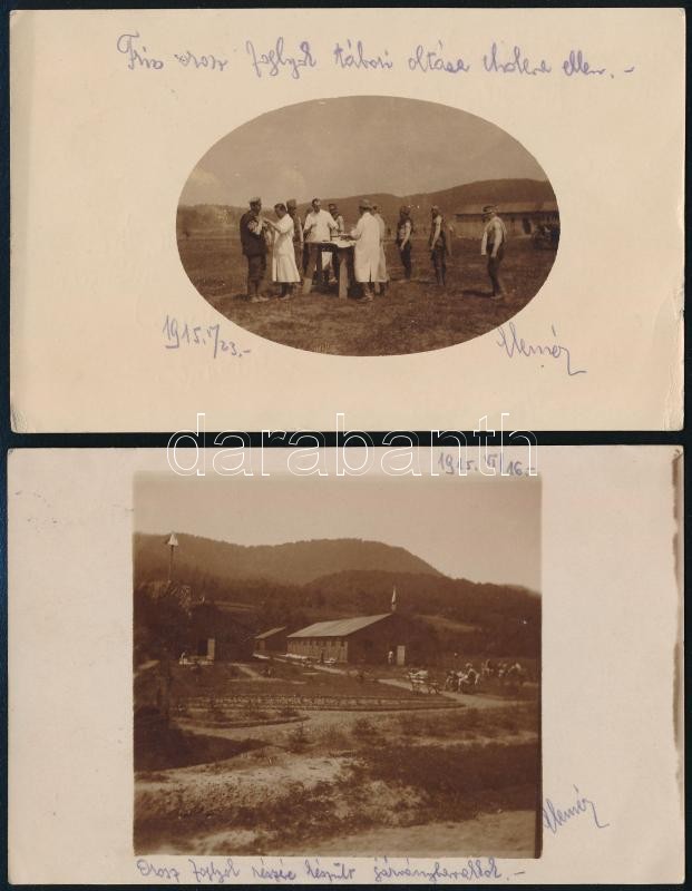 1915 Osztrák-magyar hadifogolytábor, védoltás beadásával, és járványbarakkokkal a képeken, tábori korházból küldött fotólapok, pecséttel, feliratozva, 4 db, 9x14 cm./ 1915 Austrian-hungarian prison camp, injection vaccines, epidemiological barracks on the pictures, photocards from the fieldhospital, with seals and writings, 4 pc, 9x14 cm.