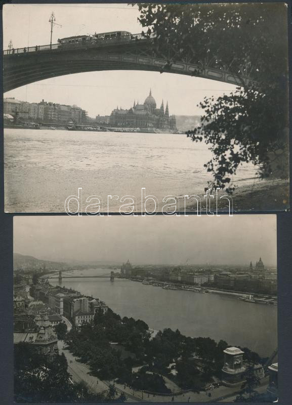 cca 1930 Budapesti látképek (Parlament a Margit híd felől, és a dunai panoráma a Szabadság-híd felől), 2 db, a hátoldalán feliratozva, 13x18 cm.